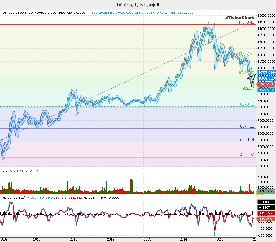 وجد المؤشّر العام للسوق القطري دعما هامّا عند مستوى 8357.88 نقطة والذب بدأ منه في موجة صاعدة 9683.62 نقطة. ويتّضح لنا على الرسم البياني أن المؤشّر العام يسير على قواعد موجات الإليوت حيث من المنتظر ، وبناءا على هذا القواعد، أن يبلغ طول هذه الموجة مستوى 1000 نقطة كهدفا أوّلا.