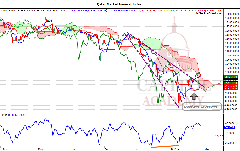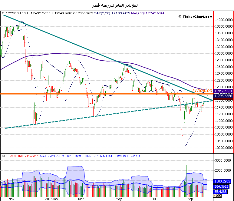 نلاحظ على الرسم البياني اليومي أن المؤشر العام القطري سار على خطى باقي أسواق الخليج مرتفعا بعد الإنتعاش الذي حققته اسعار النفط.
