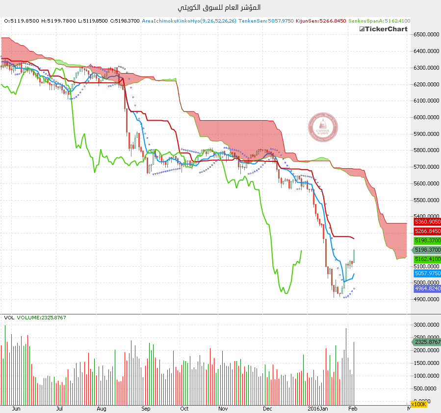 نلاحظ على الرسم البياني اليومي أن المؤشر العام الكويتي اتفع قليلا في اخر أسبوع من شهر يناير 2016.
