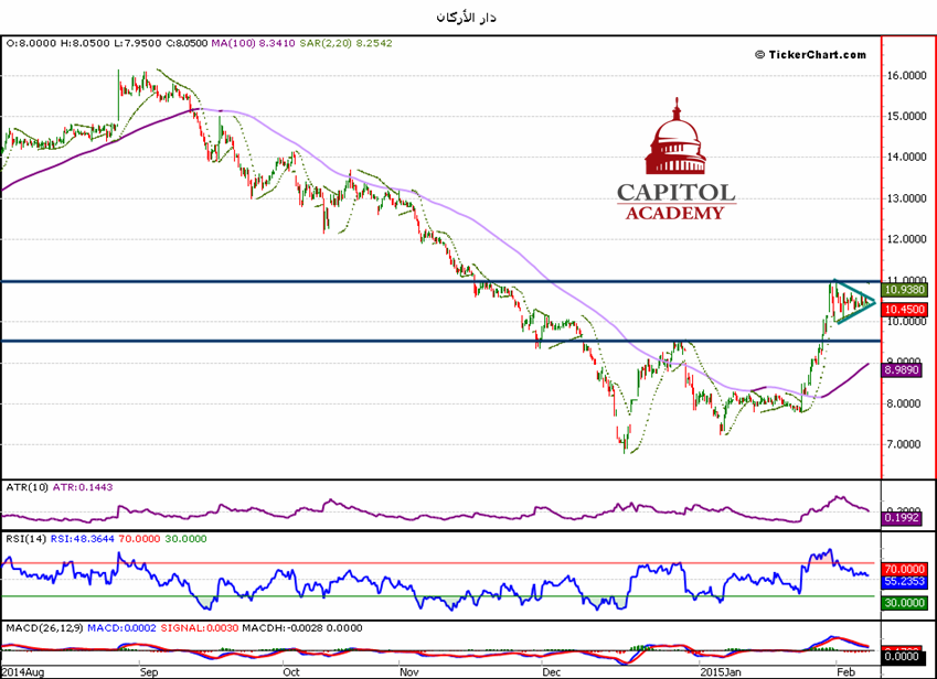 تتداول أسعار هذا السهم داخل مثلث منذ الشهر 5/2013 مكونة منطقة دعم قوية