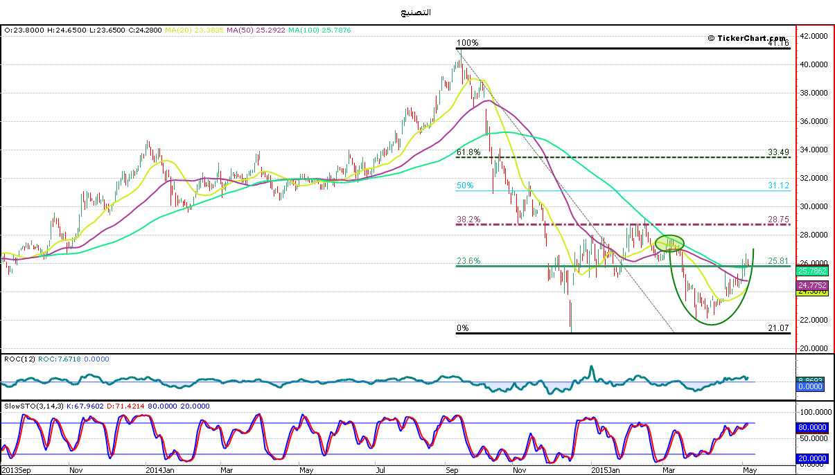 تتداول أسعار هذا السهم داخل مثلث منذ الشهر 5/2013 مكونة منطقة دعم قوية عند مستوى23.70. ننتظر ان الأسعار ستحاول اختبار هذه المنطقة قبل أيعملية صعود. نجلب إنتباهكم أن مؤشر الستوكاستيك موجود الان في منطقة تشبع بيع.وأن مؤشر الستوكاستيك والأرسي (RSI) يشيران إلي ديفرجنس مع الأسعار, وهو إنذار قوي علي أن هبوط الأسعار بدأ تيفقد قوته و سينعكس لأعلى خلال حصص التداول للأسبوع القادم.